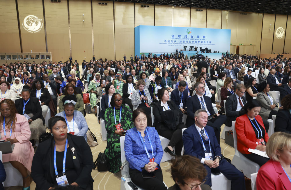 国家会议中心,不同肤色、语言和文化交融。全体会议会场外,“华韵承芳·非遗共赏”女性主题特展前,各国代表流连于精美中式作品间,感受东方文明之美;会场内,穹顶灯光如星河倾泻,精彩发言引发共情共鸣,掌声阵阵。