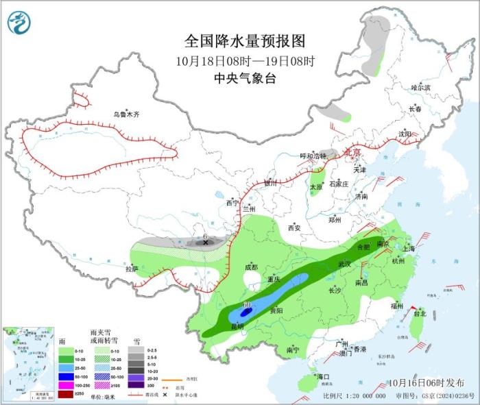 10月18日08时至19日08时,内蒙古东北部、西藏东北部、青海南部、川西高原北部等地部分地区有小雪或雨夹雪,其中,川西高原北部等地部分地区有中到大雪(5~6毫米)。江淮西部、江汉东部、湖南北部、西南地区东南部、云南中部等地部分地区有中到大雨,其中,云南东北部和中部等地部分地区有暴雨(50~60毫米)。内蒙古中部、黑龙江东北部、辽宁东部、山东中东部、安徽、江苏南部、江西北部等地部分地区有4~5级风。台湾海峡、渤海海峡、黄海大部、东海北部、巴士海峡、南海东北部等海域有5~7级风,阵风8~9级。