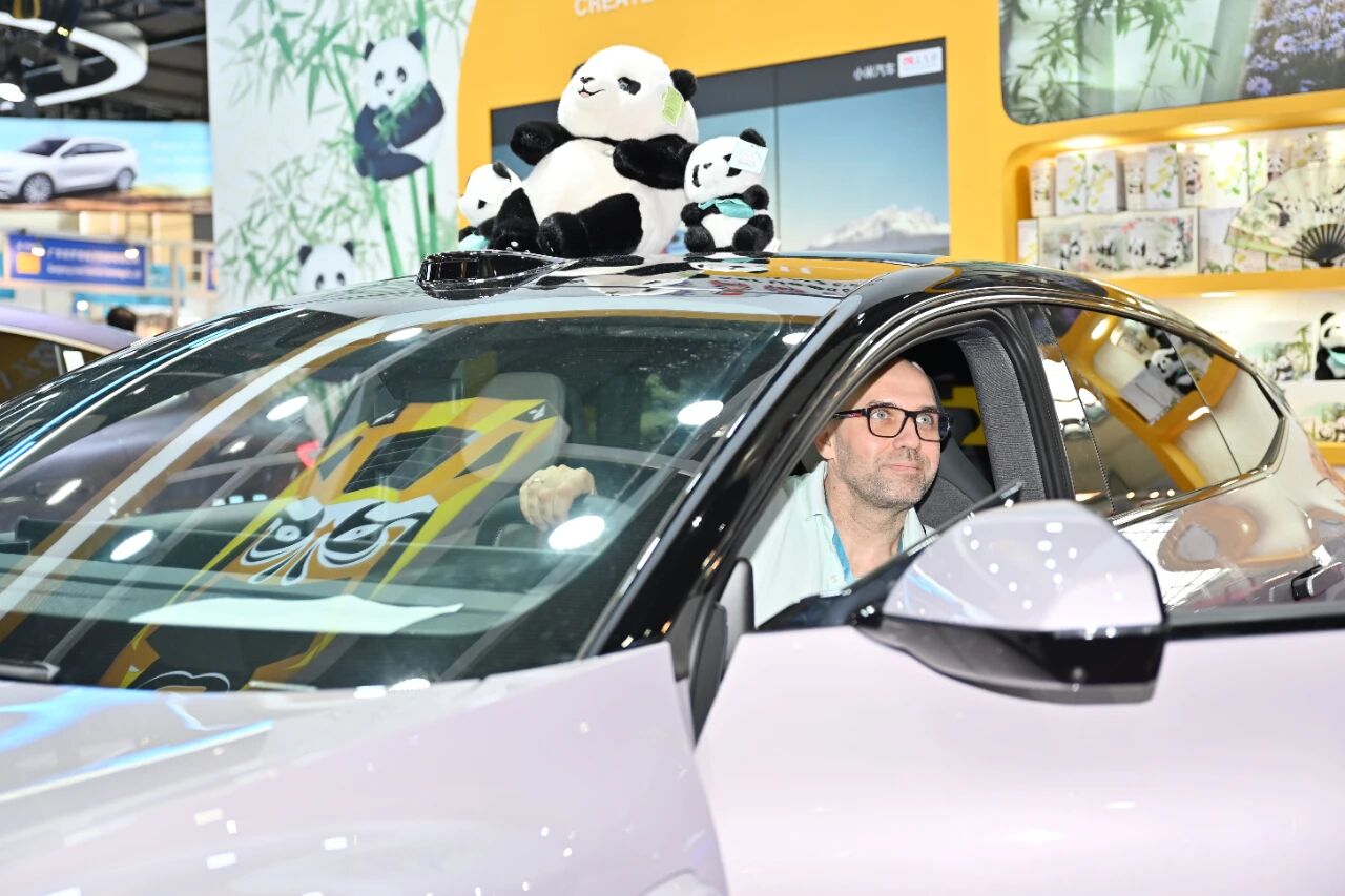 2025年10月16日,第138届广交会展出的新能源汽车吸引境外采购商参观体验。中新社记者 陈楚红 摄