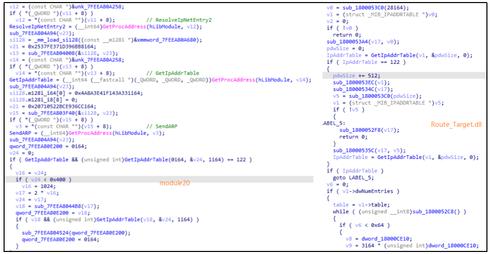 图 module20(左)与Route_Target.dll(右)代码同源性对比