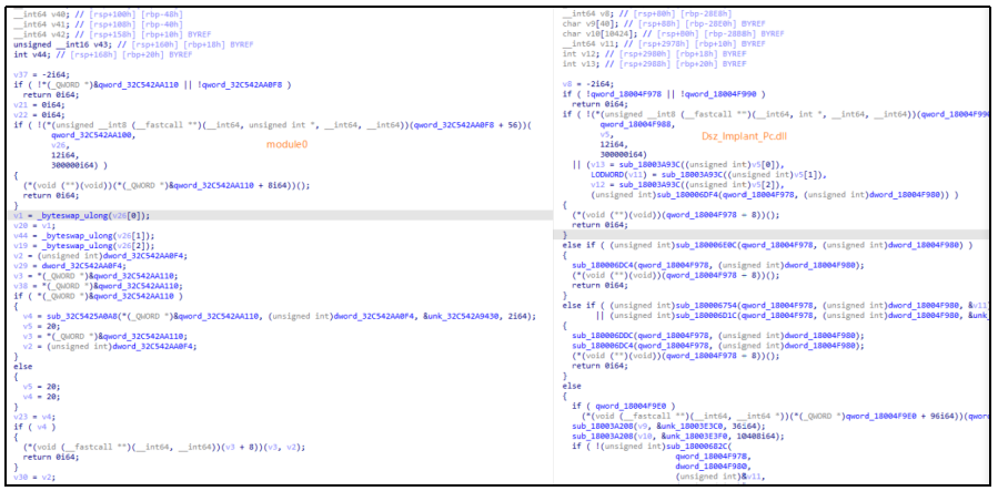 图 module0(左)与Dsz_Implant_Pc.dll(右)代码同源性对比