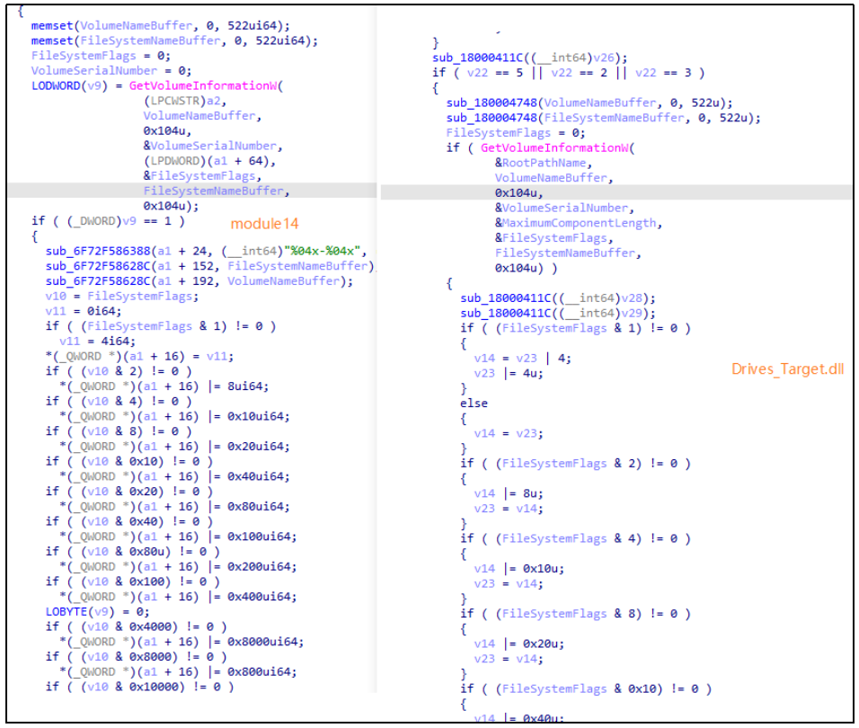 图 module14(左)与Drives_Target.dll(右)代码同源性对比