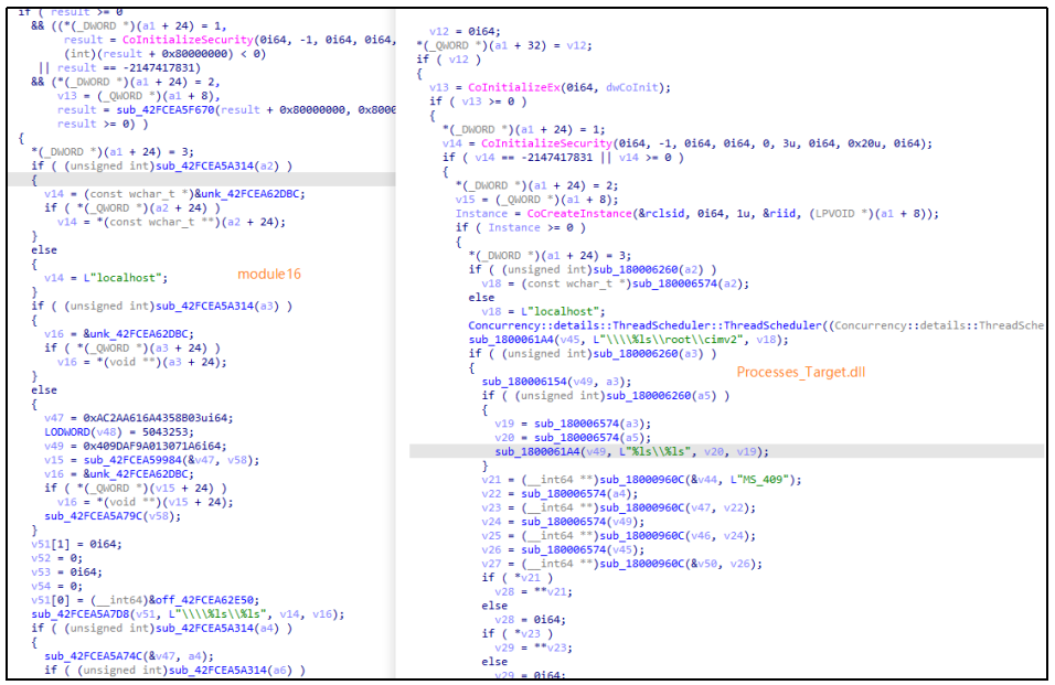 图 module16(左)与Processes_Target.dll(右)代码同源性对比