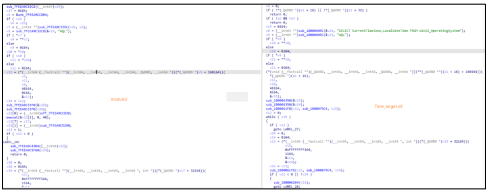 图 module2(左)与Time_Target.dll(右)代码同源性对比