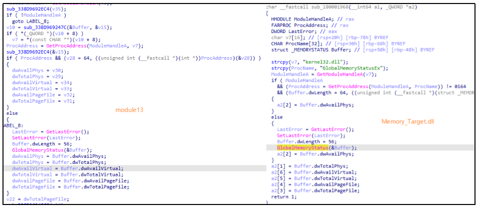 图 module13(左)与Memory_Target.dll(右)代码同源性对比