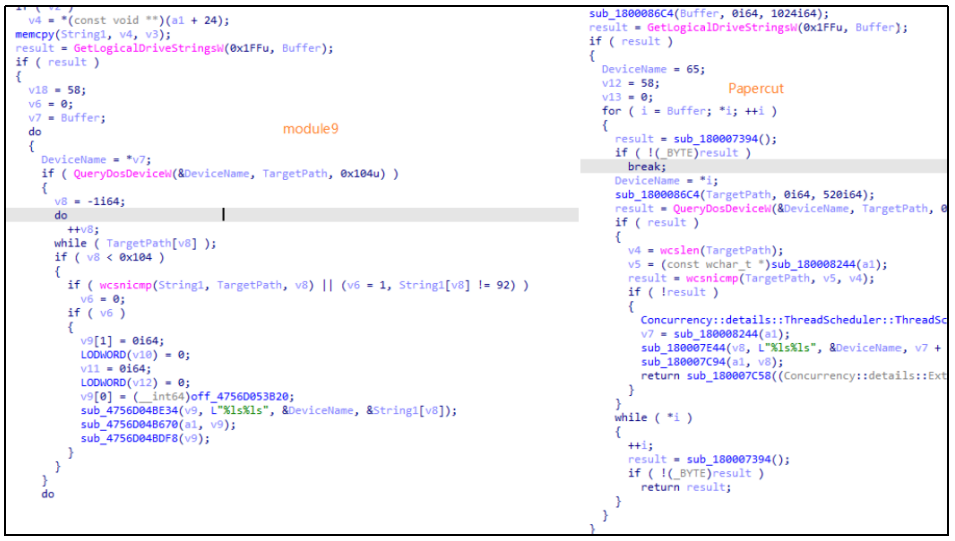 图 module9(左)与Papercut_Target.dll(右)代码同源性对比