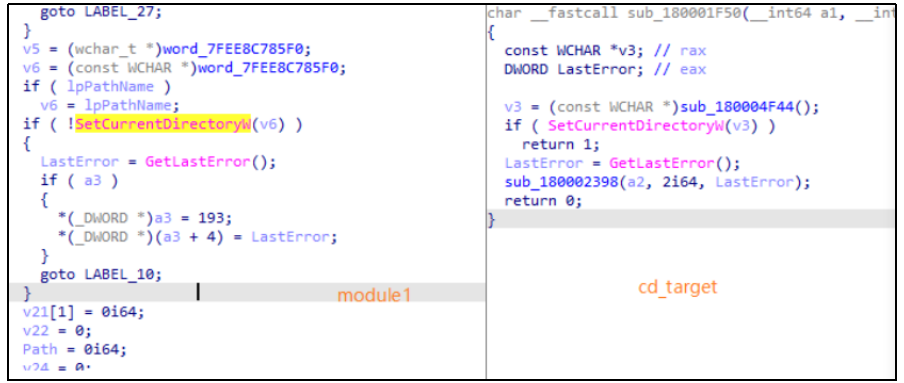 图 module1(左)与Cd_Target.dll(右)代码同源性对比