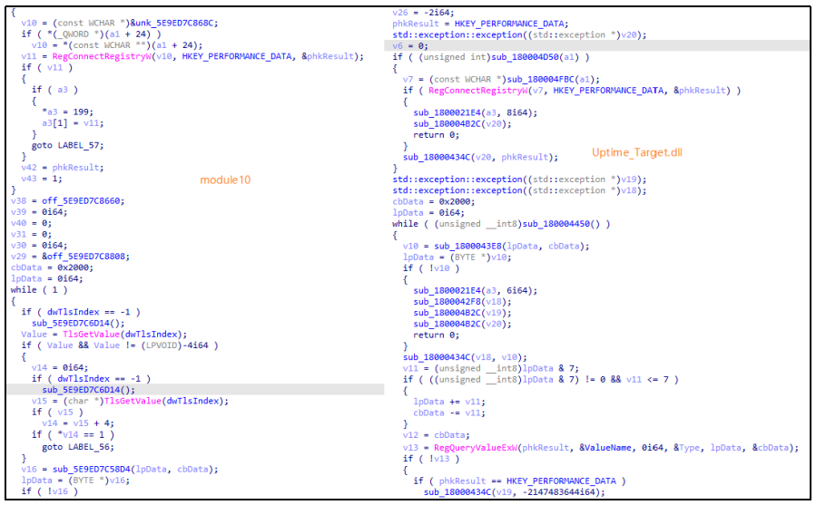 图 module10(左)与UpTime_Target.dll(右)代码同源性对比