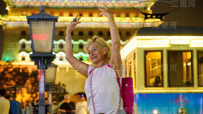 2025年9月10日,北京前门大街,外国游客感受古都夜韵。