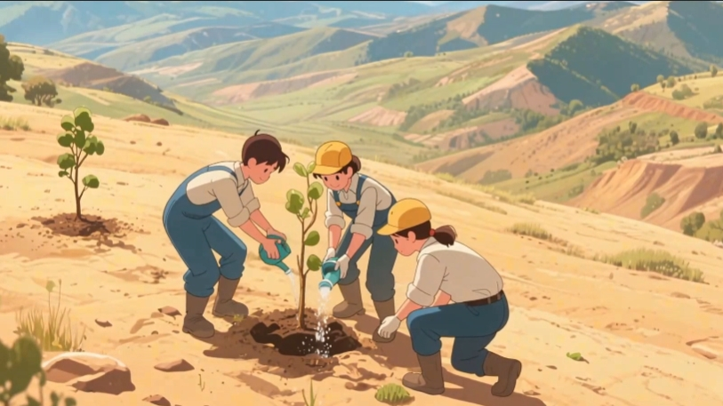 将一株株树苗种进干涸的土地