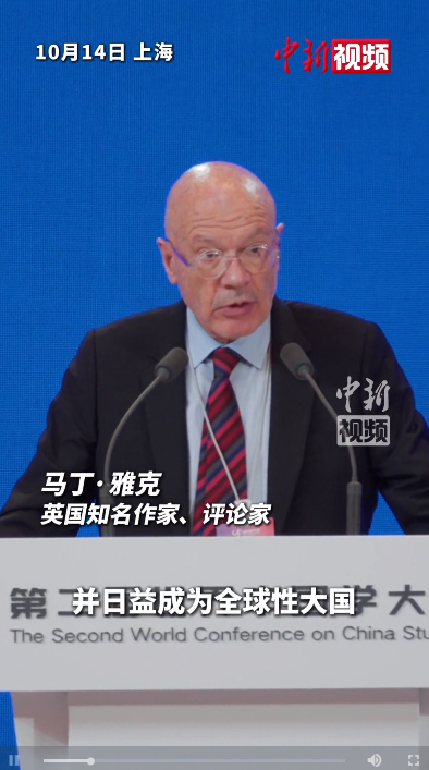 10月13日至15日,第二届世界中国学大会在上海国际会议中心举办。10月14日,英国知名作家、评论家马丁·雅克在会上表示,随着中国的崛起并日益成为全球性大国,在世界各地的影响力与日俱增,中国学以及对中国学的关注已然成为一种全球现象。(记者 李佳悦 康玉湛 制作 王佳琪)