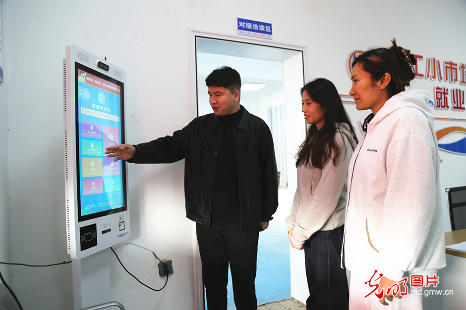 新疆阿克苏地区阿瓦提县人社局举办2025年金秋招聘月专场招聘会,来自纺织、商场、人寿、酒店、文旅等行业的30家民营企业提供420个就业岗位,吸引了许多求职者前来应聘。图为工作人员正在向求职者介绍岗位信息。(包良廷摄/光明图片)