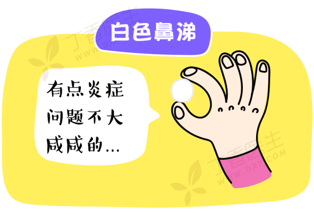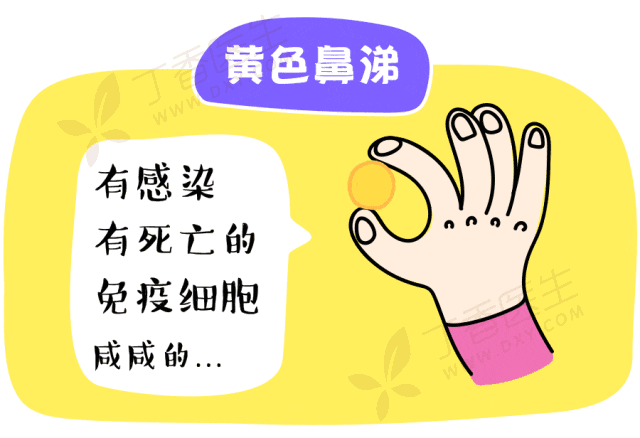 黄鼻涕:随着疾病进展到后期,身体的免疫部队被不断动员,白细胞们“战死沙场”,粘液流动减慢,鼻涕就变得粘稠、浑浊了,开始变黄变绿。