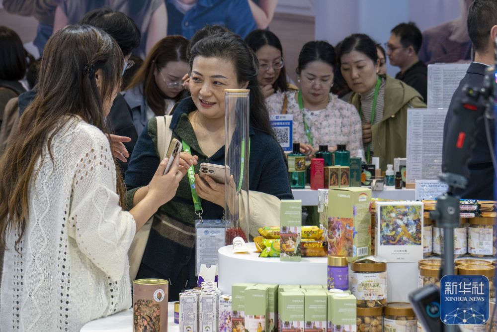 ↑ 11月7日,在第八届进博会消费品展区,参观者选购来自伊朗的玫瑰制品。新华社记者 丁赫 摄