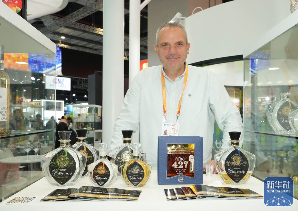 ↑ 11月6日在第八届进博会农食产品展区拍摄的塞尔维亚烈酒。新华社记者 任鹏飞 摄