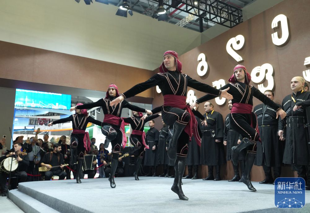 ↑ 11月7日,工作人员在第八届进博会国家展格鲁吉亚馆表演舞蹈。新华社记者 任鹏飞 摄