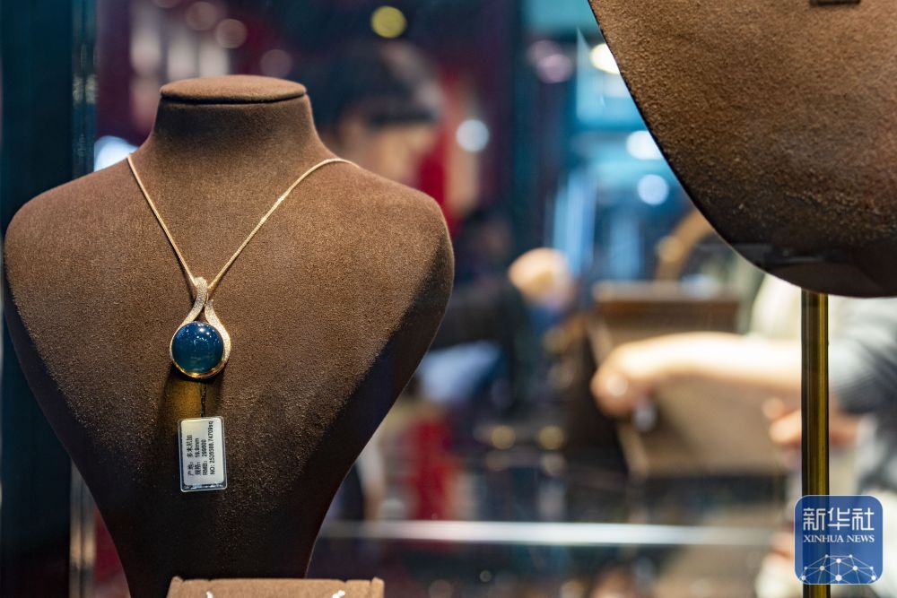 ↑ 11月7日在第八届进博会消费品展区拍摄的产自多米尼加的蓝珀。新华社记者 丁赫 摄