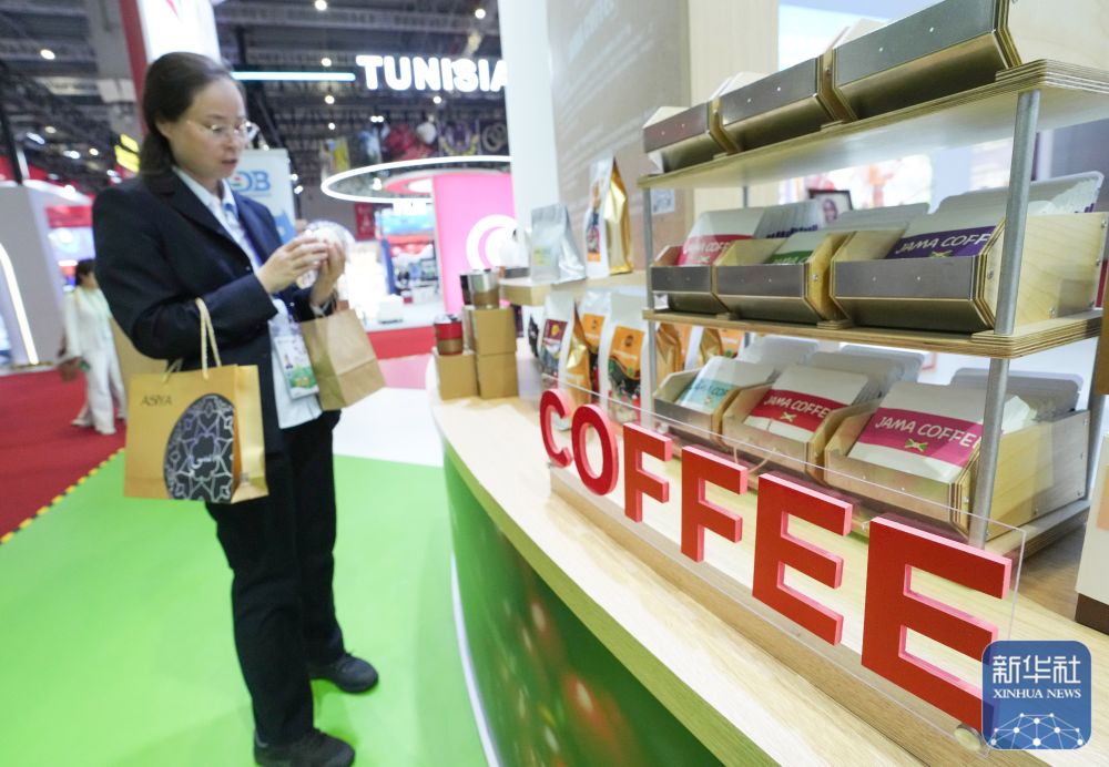 ↑ 11月7日,参观者在第八届进博会国家展布隆迪馆了解一款咖啡。新华社记者 任鹏飞 摄