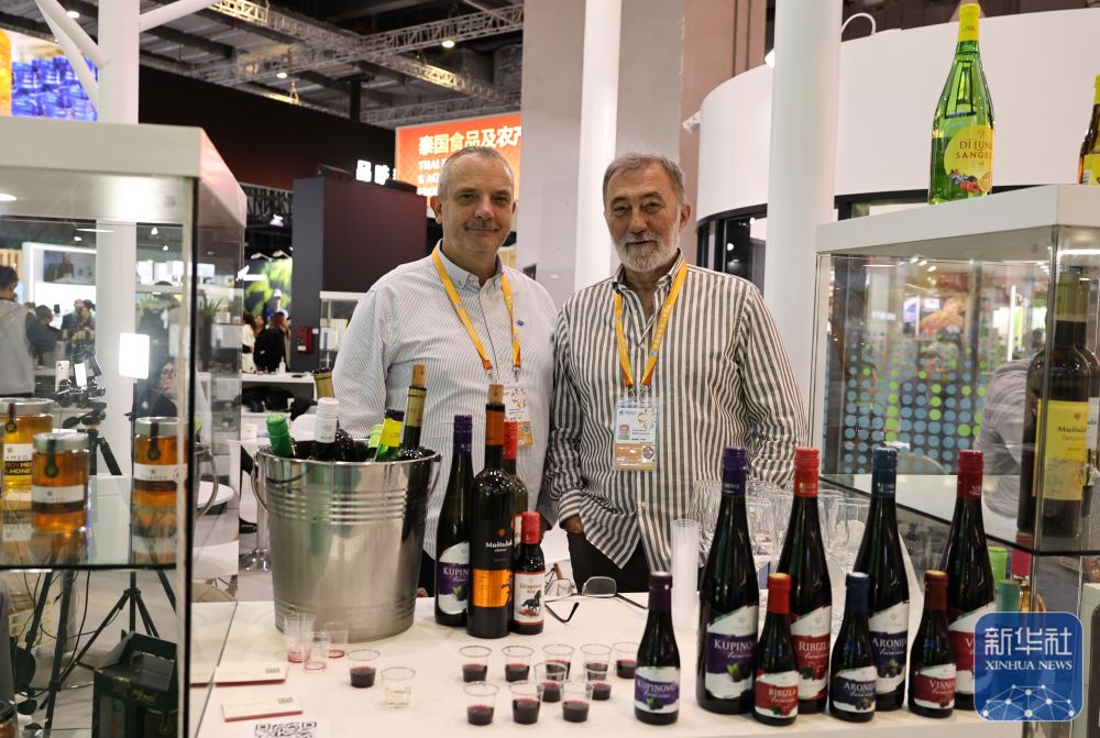 ↑ 11月7日在第八届进博会农食产品展区拍摄的来自塞尔维亚的酒。新华社记者 方喆 摄