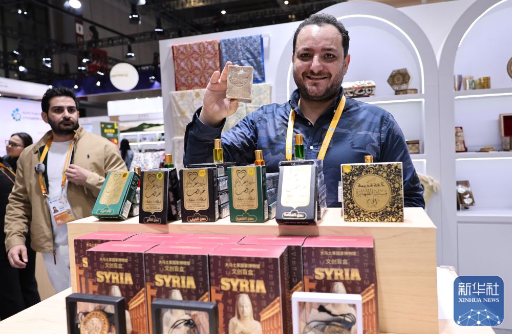 ↑ 11月7日,在第八届进博会消费品展区,一名叙利亚展商展示叙利亚古皂。新华社记者 方喆 摄