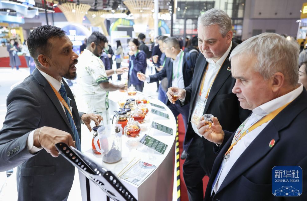 ↑ 11月7日,在第八届进博会国家展斯里兰卡馆,展商(左一)推介锡兰红茶。新华社记者 孟晨光 摄