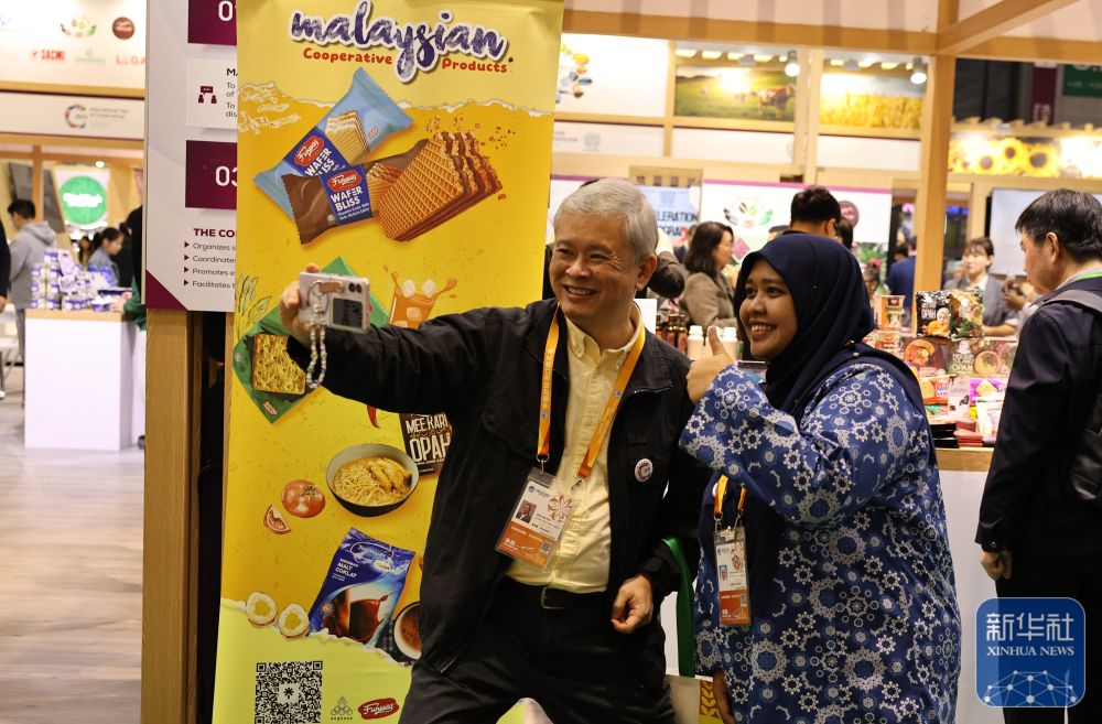 ↑ 11月7日,在第八届进博会农食产品展区,新加坡展商(左)和马来西亚展商合影。新华社记者 方喆 摄