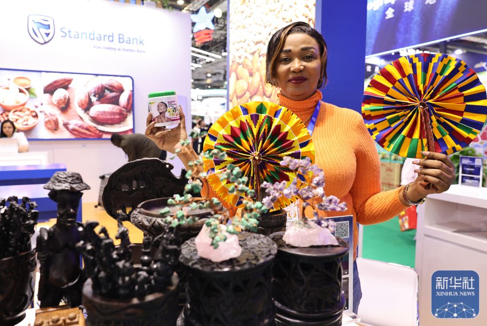 ↑ 11月7日,在第八届进博会农食产品展区,来自加纳的展商展示当地特色折扇和牛油果润肤乳。新华社记者 方喆 摄
