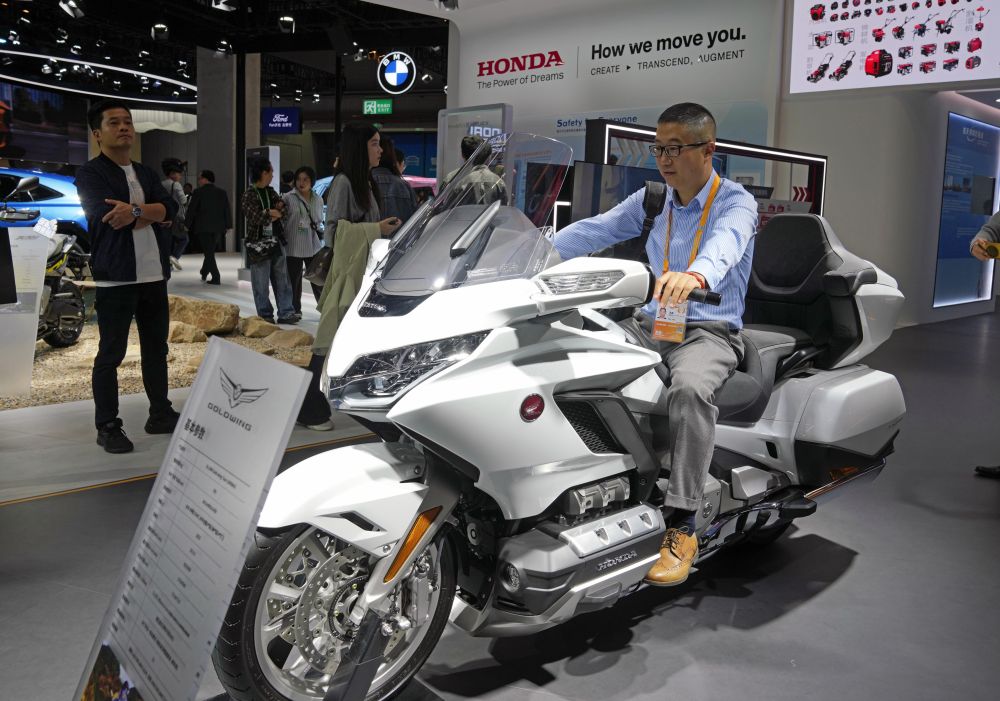 ↑11月6日,在汽车及智慧出行展区本田展台,参观者体验摩托车展品。