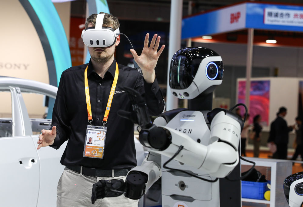 ↑ 11月5日,工作人员在第八届进博会技术装备展区展示一款工业场景人形机器人。