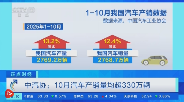 最新数据显示,2025年1至10月份,我国汽车产销量分别完成2769.2万辆和2768.7万辆,同比增长均超过10%。其中,新能源汽车产销量分别完成1301.5万辆和1294.3万辆,同比分别增长33.1%和32.7%。