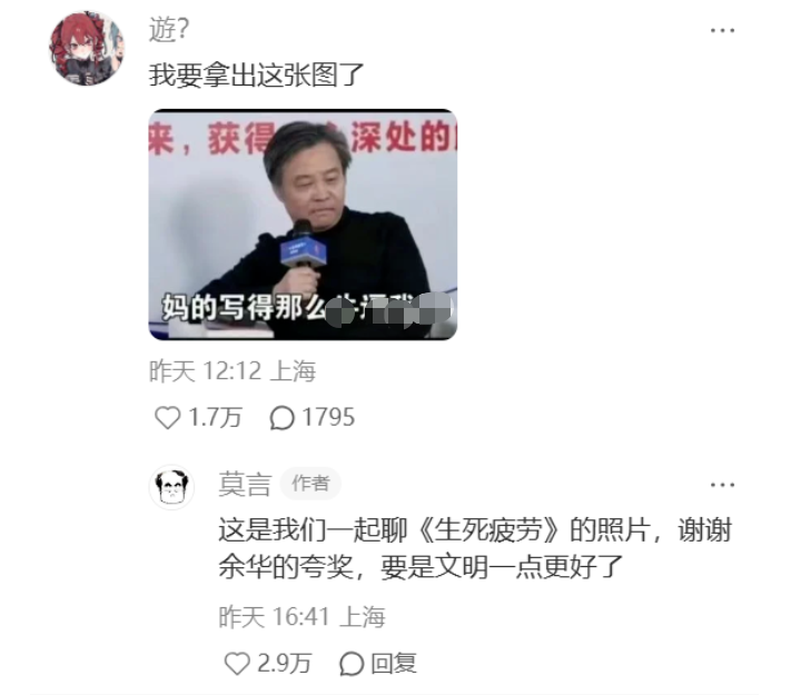 此外,不少网友在评论区“热梗频出”,莫言也一本正经地回复。