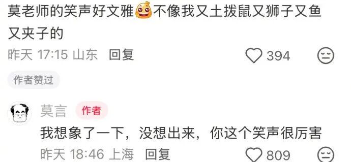 莫言在评论区展现出幽默风趣的一面,有网友大呼:“文人说话就是有意思。”“简直要笑晕在评论区。”