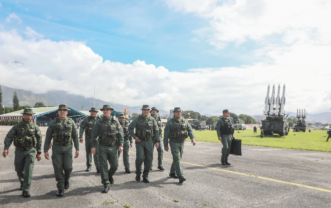 11日演习期间,委内瑞拉防长洛佩斯(左三)和军方高级指挥官在首都加拉加斯附近视察。图源:外媒