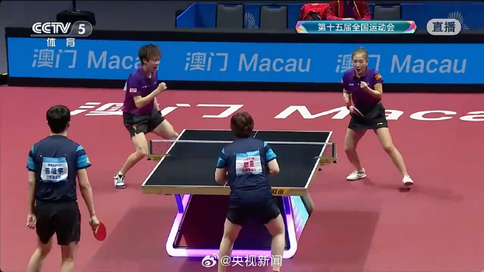 11月14日晚,十五运会乒乓球项目在澳门银河综艺馆产生成年组首个金牌。在刚刚结束的混双决赛中,广东队组合林高远/刘诗雯以4∶2战胜江苏队组合陈垣宇/蒯曼,夺得冠军。