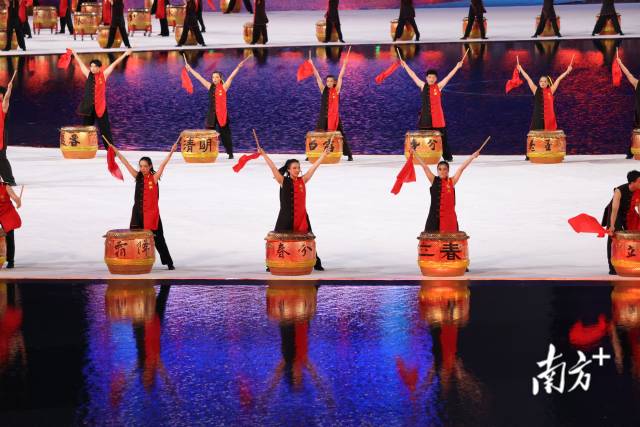 11月9日,第十五届全运会在广州开幕,潮州二十四节令鼓震撼开场,150名青少年鼓手以青春之鼓擂动传统之声,点燃现场气氛。南方+记者 苏韵桦 摄