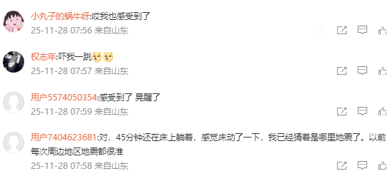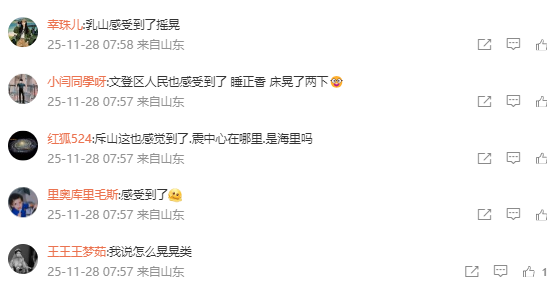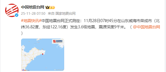 中国地震台网正式测定:11月28日07时45分在山东威海市荣成市(北纬36.82度,东经122.16度)发生3.6级地震,震源深度9千米。