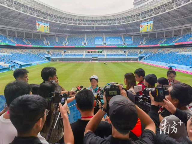 媒体记者在深圳市体育中心采访志愿者。