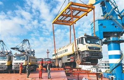 十二月八日,国产卡车在山东港口烟台港装船出口。唐克摄(人民视觉)