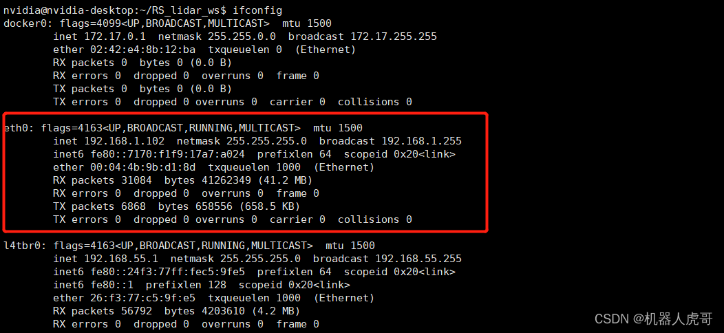 我是将雷达直接连到板子网口的,所以对应网口IP我需要设置一个固定IP。将主板IP改成雷达要求的192.168.1.102,雷达IP已经被我们恢复默认的192.168.1.200