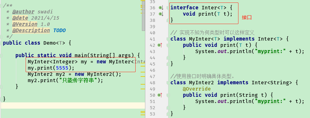如你所见,所有出现的 Object 都被 T 取代,类型变量 T 可以是任何类型。同样的技术也可以应用于创建通用接口。下边是对于接口的声明示例: