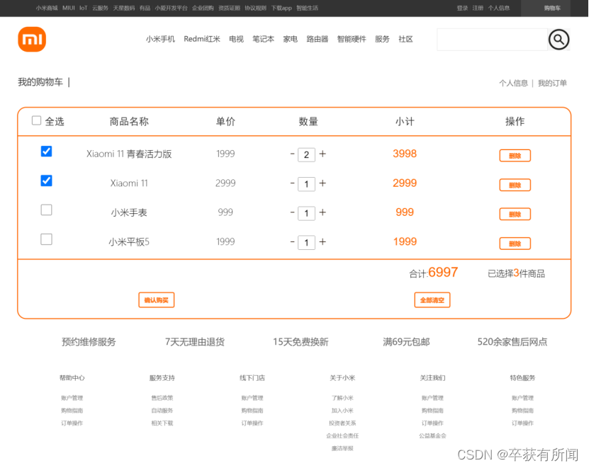 购物车可以全选和单选你之前加购的商品中要支付的商品,然后根据选择计算出商品总数量和总价格,也可以对商品数量手动输入和加减号改变数量,之后小计也会跟着改变。还可以删除商品功能,删除后会重新计算总价和总数,也可以确认购买和全部清楚。