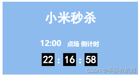 秒杀的倒计时实现,可以设置一个固定时间然后对这个时间进行倒计时,比如对12点进行倒计时,那么现在凌晨一点多分,所以显示还剩22小时。