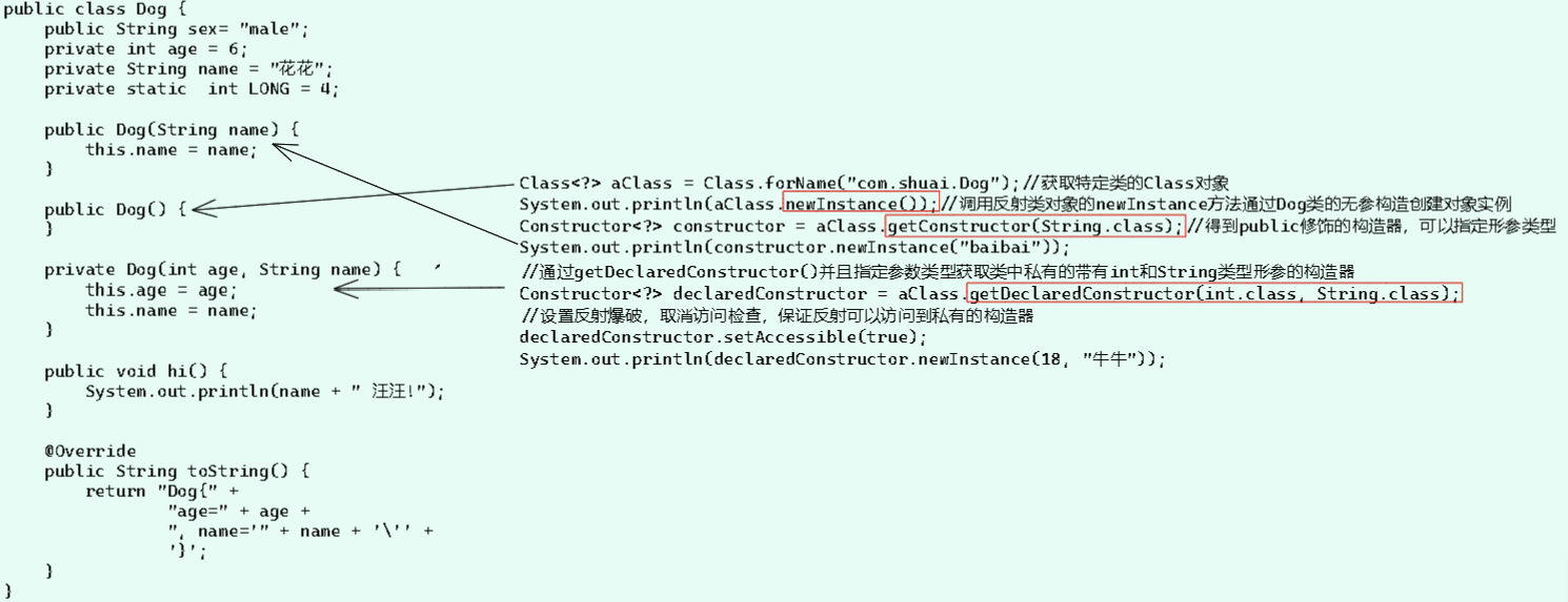 利用除反射之外的技术显然是无法在运行阶段动态加载Dog类并创建Dog实例对象的,但是利用Java的反射机制,就可以实现动态加载的效果,并且可以通过修改配置文件在不带便源码的情况下控制程序(例如将配置文件中的method换成别的方法名称,可以不改变源码而调用对象实例的更换的方法):