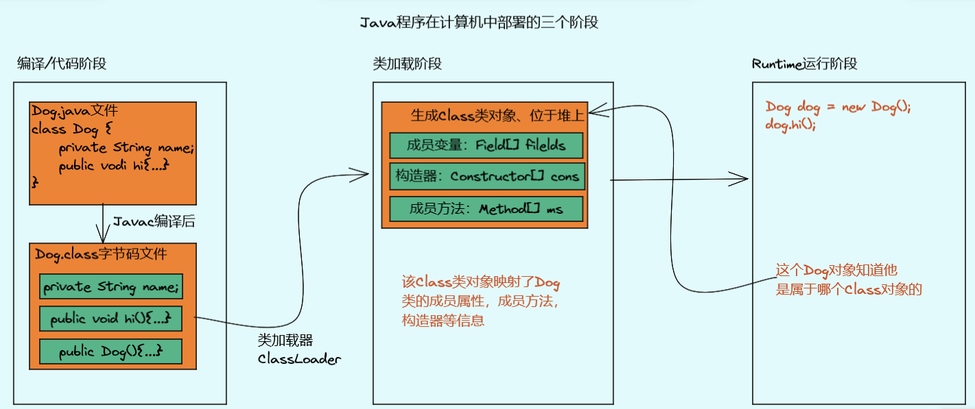 在弄清楚反射机制前,需要先对Java程序的三个部署阶段(编译阶段、加载阶段、运行阶段)进行学习: