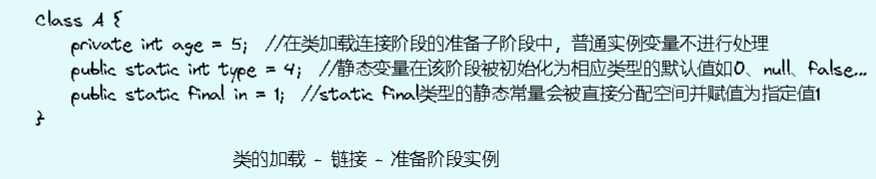 JVM在该阶段会对静态变量进行内存分配和默认初始化(初始化为对应数据类型的默认值),静态变量所使用的内存将在方法区中进行分配。