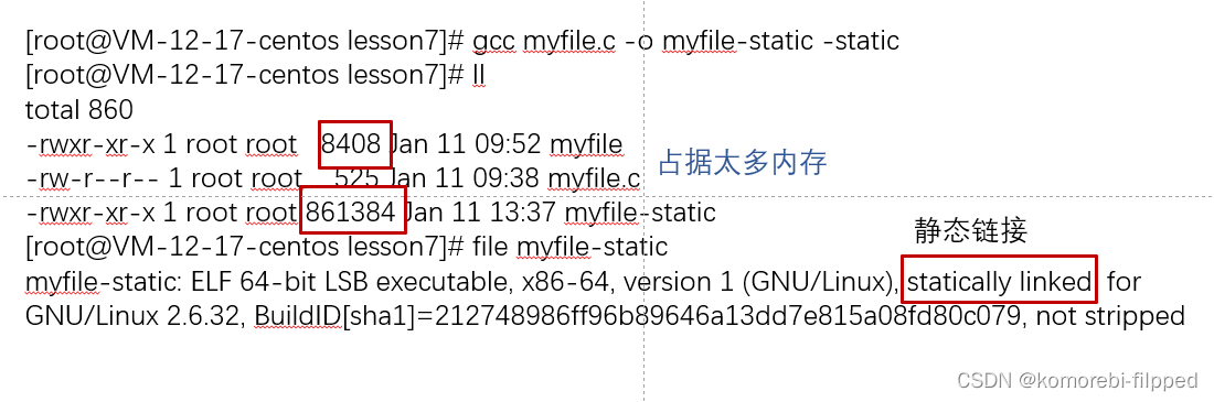 [root@VM-12-17-centos lesson7]# gcc myfile.c -o myfile-static -static [root@VM-12-17-centos lesson7]# ll total 860 -rwxr-xr-x 1 root root 8408 Jan 11 09:52 myfile -rw-r--r-- 1 root root 525 Jan 11 09:38 myfile.c -rwxr-xr-x 1 root root 861384 Jan 11 13:37 myfile-static [root@VM-12-17-centos lesson7]# file myfile-static myfile-static: ELF 64-bit LSB executable, x86-64, version 1 (GNU/Linux), statically linked, for GNU/Linux 2.6.32, BuildID[sha1]=212748986ff96b89646a13dd7e815a08fd80c079, not stripped