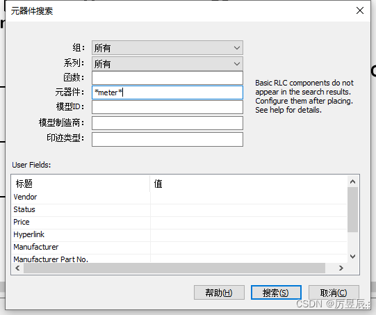 ② 单击“搜索”按钮,弹出“元器件搜索”对话框,在“元器件”栏输人“*meter*”。如图所示:
