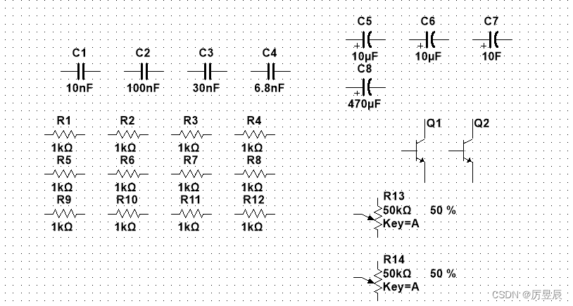 ②继续放置不同值的电容器元器件,该电路中还包括的无极性电容有100nF、6.8nF、30nF 电容,放置结果如图所示。